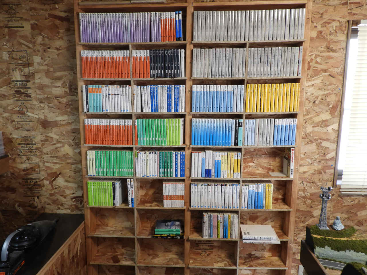 - 溜まってしまって文庫本を収納、左側「今野敏」右側「堂場瞬一」。